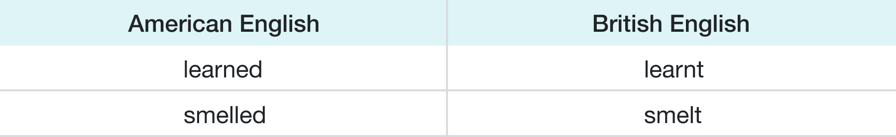 In British English, some verbs form the past tense with the suffix –t, while in American English they have regular past tense forms ending in –ed. Other differences include the extremely popular past particle of the verb get – in US (gotten), in UK (got).